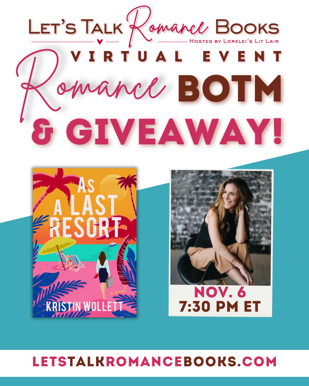 Meet & Greet debut romance author, Kristin Wollett, author of AS A LAST RESORT, on November 6 at 7:30 pm ET!