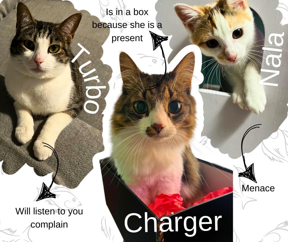 I have four cats. Turbo, Charger, Nala and Squeak. Iāve also discovered that four is technically the legal limit. Ha!